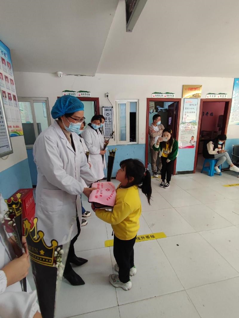 在集州街道红塔社区卫生服务中心,非公经济组织代表杨梅幼儿园师生身着园服,陆续来到大厅疫苗接种点。小朋友们在老师的带领下,整齐有序地将鲜花献给护士阿姨们,与她们热情相拥,逐一向护士阿姨们表达节日的祝福。在国际妇女节这个特殊的日子,收到幼儿园老师和孩子们的祝福,大家都表示特别感动。