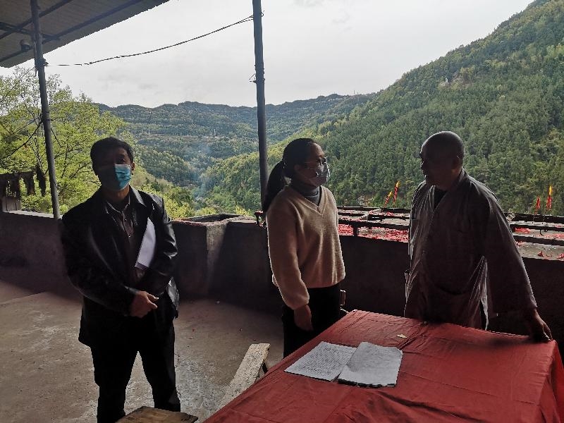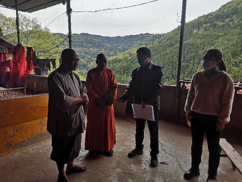近日,南江县委统战部、县民宗局一行深入正直镇龙耳山寺、沙河镇天桥寺、集州街道琉璃寺等宗教活动场所,实地检查指导疫情防控、消防安全和食品安全等相关工作,各乡镇、村(社区)有关工作人员陪同检查。