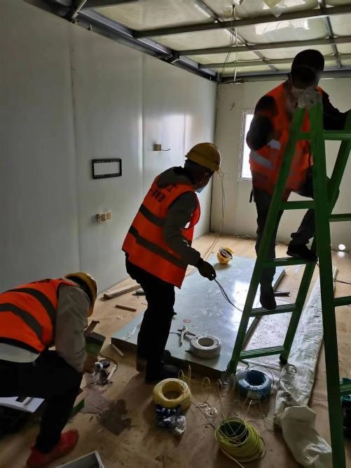 在崇明临时隔离用房项目现场,所有参与的建设者不分昼夜、全力冲刺,室外总体及机电安装施工任务正有序推进中。