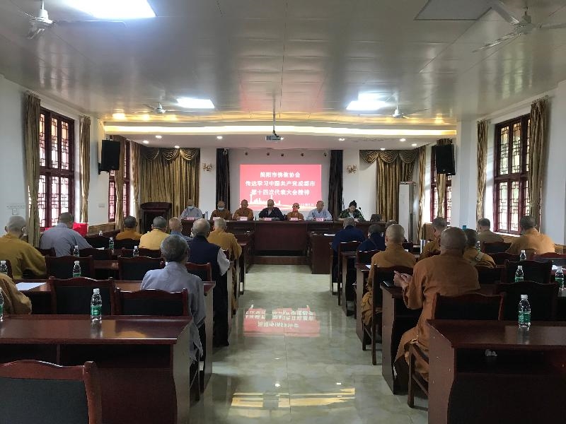 5月12日,简阳市佛教协会组织召开专题会议,传达学习中国共产党成都市第十四次代表大会精神。佛协会长宗妙法师主持会议,佛协班子成员、各寺院负责人及常住僧众参会。