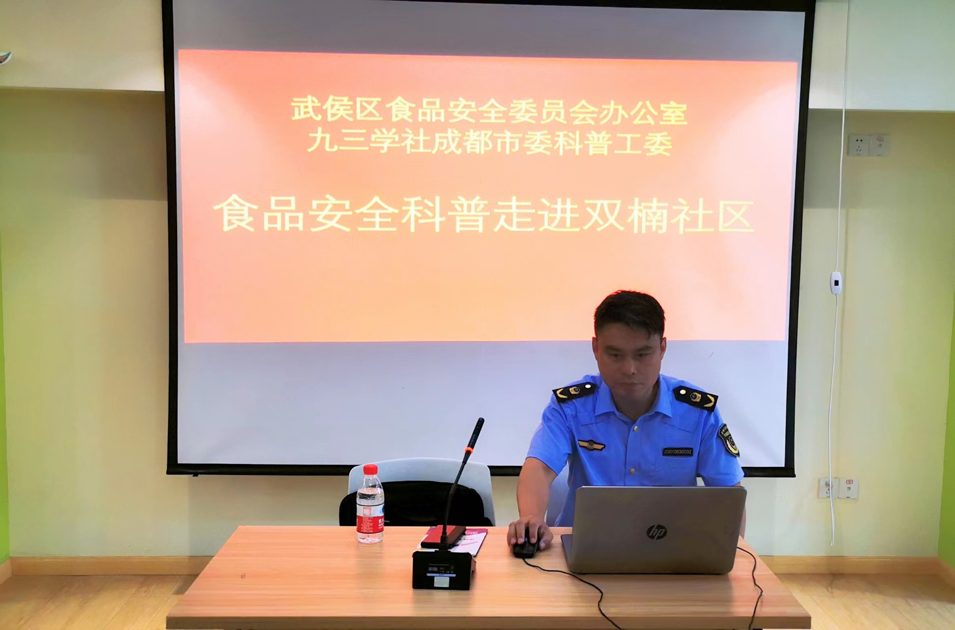 6月23日,九三学社成都市科普工作委员会联合武侯区食安办,走进双楠社区开展食品安全科普活动。食品安全巡查代表、辖区居民、餐饮商家等50余人参加。活动由九三学社成都市科普工作委员会主任蔡鹏主持。