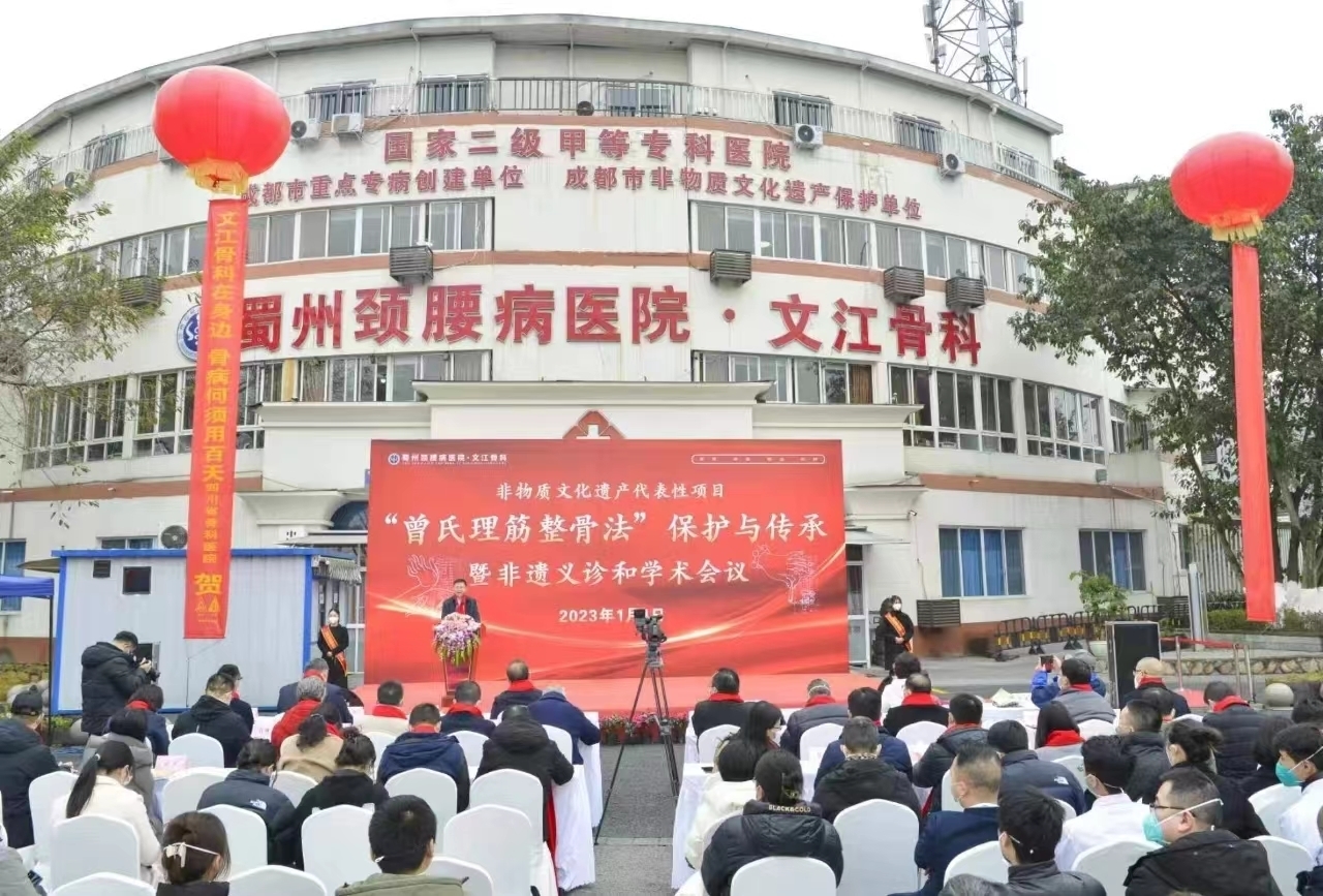 活动现场,来自蜀州颈腰病医院·文江骨科的“曾氏理筋整骨法”传承人代表发表了非遗人才基地历史文化保护与传承计划宣言;第四代代表性传承人、农工党党员、蜀州颈腰病医院院长李文江介绍了该院创新性提出“以治筋伤疗骨伤,以治骨伤愈筋伤”治疗思想,形成独具特色的“曾氏理筋整骨法”,并积极创建四川省非遗代表性项目的做法。