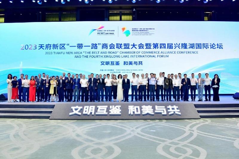 开放提能,潮涌西部。天府新区深刻践行重要节点功能定位,坚持强化内陆开放门户战略支撑,加速构建开放型产业体系,持续拓宽对外开放通道,不断扩大国际交往“朋友圈”。在“一带一路”倡议提出十周年之际,2023天府新区“一带一路”商会联盟大会暨第四届兴隆湖国际论坛如期举办,“一带一路”沿线39个国家和地区的120余家海内外商协会近420名商会会长、企业家出席,共襄“一带一路”商会联合发展大计,共鉴“一带一路”文明交流的丰硕成果。