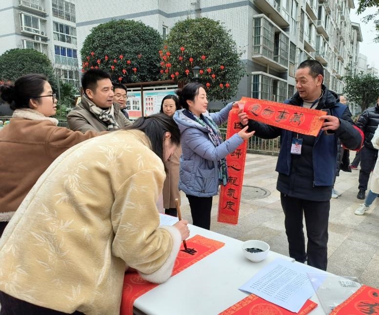 在送春联活动现场,书法家们凝神运笔、挥毫泼墨,将一副副寓意美好祝福的春联、福字送到群众手上,现场共送出春联150副,受到群众的一致好评。
