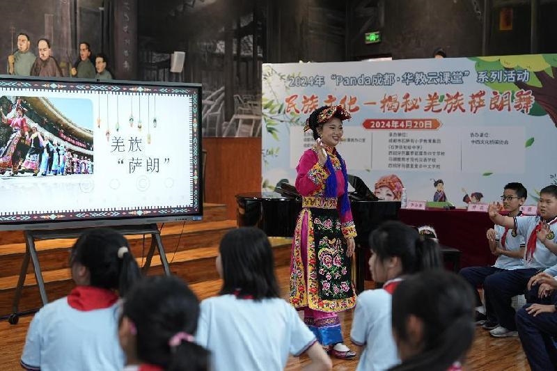 为更好向海外传播中华文化,扩大海外华文教育的影响力,2024年“Panda成都·华教云课堂”系列活动——“民族文化—揭秘羌族萨朗舞”活动,以云课堂形式连线成都和三所西班牙华文学校,向西班牙华文学校学生讲授非物质遗产文化萨朗舞,让更多海外华裔青少年和国际友人通过体验、学习,了解羌族民族特色。