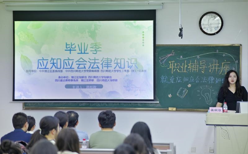 为充分发挥党外知识分子推动区域经济社会发展的“智囊团”作用,增强大学生的法律知识和风险意识,助力大学生高质量就业,5月17日下午,锦江区知联会联合四川师范大学知联会举办的“毕业季——应知应会法律知识”专题讲座,在四川师范大学狮子山校区成功举办,锦江区知联会会员、四川师范大学学生共50余人参加活动。