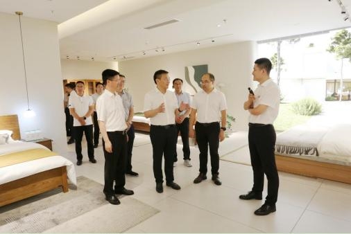 在全友家私,刘玉泉一行先后参观了定制九厂、压贴三厂和家具的成品展示场景,详细了解了企业在目前经济形势下的经营运行情况、智能制造设备的升级使用等,表达了对企业在当前市场中取得成绩的肯定,希望企业再接再厉,更好的做大做强。