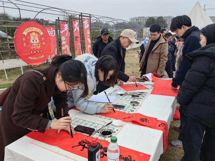五彩灯笼下悬挂着趣味灯谜,大家或低头沉思,或相互讨论,现场气氛热烈而和谐。剪窗花、写福字,绘制春联,书写新春祝福,参与者们沉浸在充满韵味的民俗艺术创作中,用独特笔触尽情展现他们的个性风采,让每一道笔画都充满新年的喜悦与幸福。