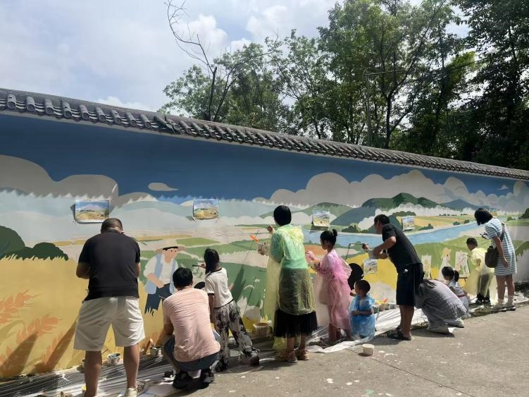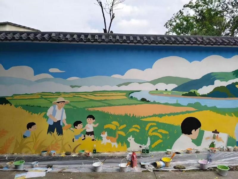 此次活动结合乡村风貌特色与村民需求,确定以“丰收”为核心主题,选取村内闲置墙面作为创作载体,既避免资源浪费,又能让艺术融入乡村日常。活动现场,艺术家们用专业笔触定下画面基调;民建会员主动承担起填色、勾线等任务,耐心细致地为麦穗、稻田、农舍等元素赋予鲜活色彩;孩子们围绕在旁,手持小画笔涂抹色彩,清脆的笑声为活动增添了蓬勃朝气;村民们也热情参与其中,有的帮忙调配颜料,有的提供工具支持,还有不少人驻足观看,为创作者们点赞喝彩,现场一派热闹和谐的景象。经过数小时的共同努力,原本单调的墙面焕然一新,金黄的稻穗随风摇曳,农民伯伯脸上洋溢着丰收的喜悦,生动的画面既展现了乡村的自然之美,也传递出对美好生活的向往。