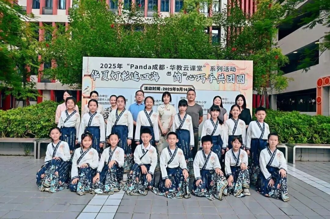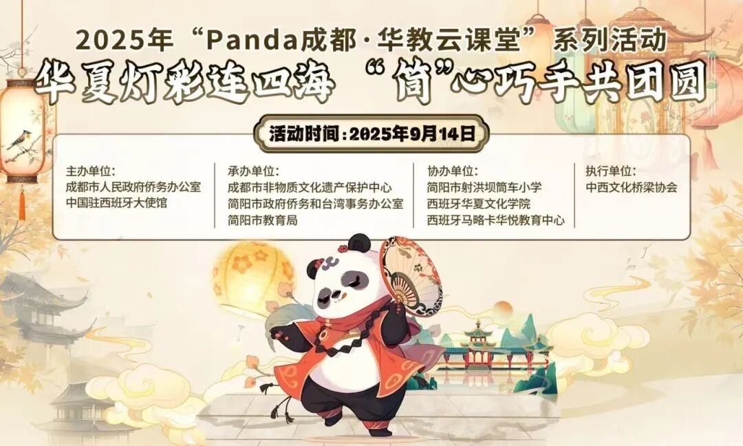 9月14日,一场以传承中华优秀传统文化、搭建中外文化交流桥梁为核心的2025年“Panda成都・华教云课堂”系列活动——“华夏灯彩连四海‘筒’心巧手共团圆”在简阳市射洪坝筒车小学温情启幕。本次活动由成都市人民政府侨务办公室、中国驻西班牙大使馆、成都市非物质文化遗产保护中心、简阳市人民政府侨务和台湾事务办公室、简阳市教育局联合主办,简阳市射洪坝筒车小学、马德里华夏文化学院、马路卡华悦教育中心协办,中西文化桥梁协会全程执行,为成都与西班牙两地学子搭建起一场跨越山海的文化盛宴。