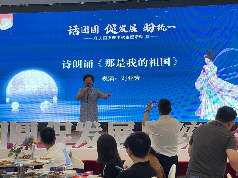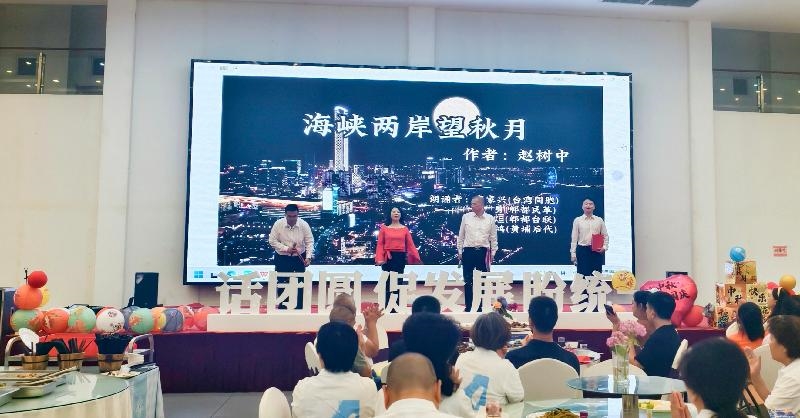 文艺表演环节成为两岸同胞情感共鸣的纽带。来自郫都区黄埔后代联工委的诗朗诵《那是我的祖国》、民革郫都区总支部的诗朗诵《中国的月亮》、参会单位联合表演的诗朗诵《海峡两岸望秋月》和歌曲《爱拼才会赢》,满是“此乡亦故乡”的真挚感情,现场欢声笑语不断,浓浓的亲情在空气中流淌。