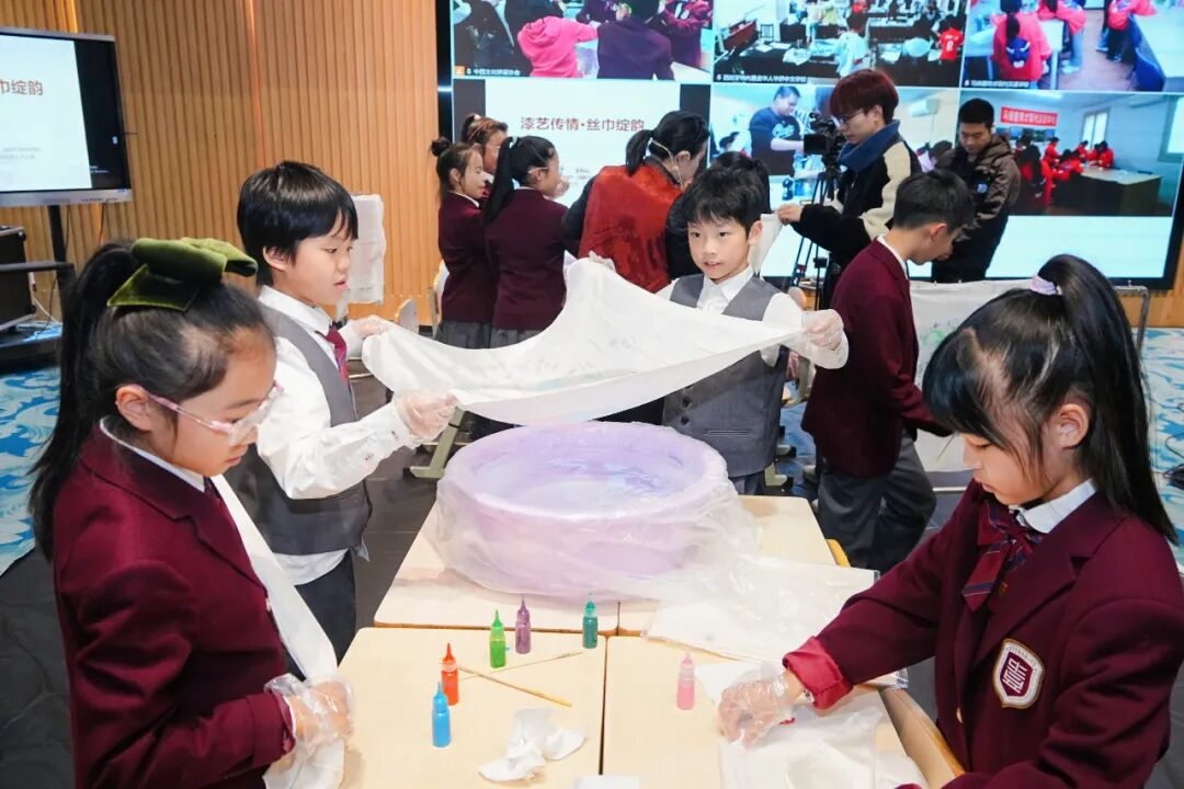 成都活动现场第二节课由四川省工艺美术大师、成都漆艺省级代表性传承人王杉山带来中华传统文化课程——《成都漆艺》。课堂从欣赏一件件独具特色的传统漆器开启,王杉山深入浅出地介绍了中国大漆艺术的辉煌历史与核心工艺。孩子们通过看一看、摸一摸,感受漆器的美感与特点。随后,双方学生跟着老师以水为画布,以漆为墨彩,在水面点染缤纷色彩,将素白丝巾轻覆其上,印出一幅幅独具创意的流动画卷。中西学子通过观察、讨论、视频互动、亲手制作等多种方式,在实践中感悟匠心精神,领略国家级非物质文化遗产的独特魅力,在协同创作中交流文化,在技艺体验中深化友谊,一条条丝巾,不仅是个人创意的绽放,更成为连接东西方文化的美丽信物。