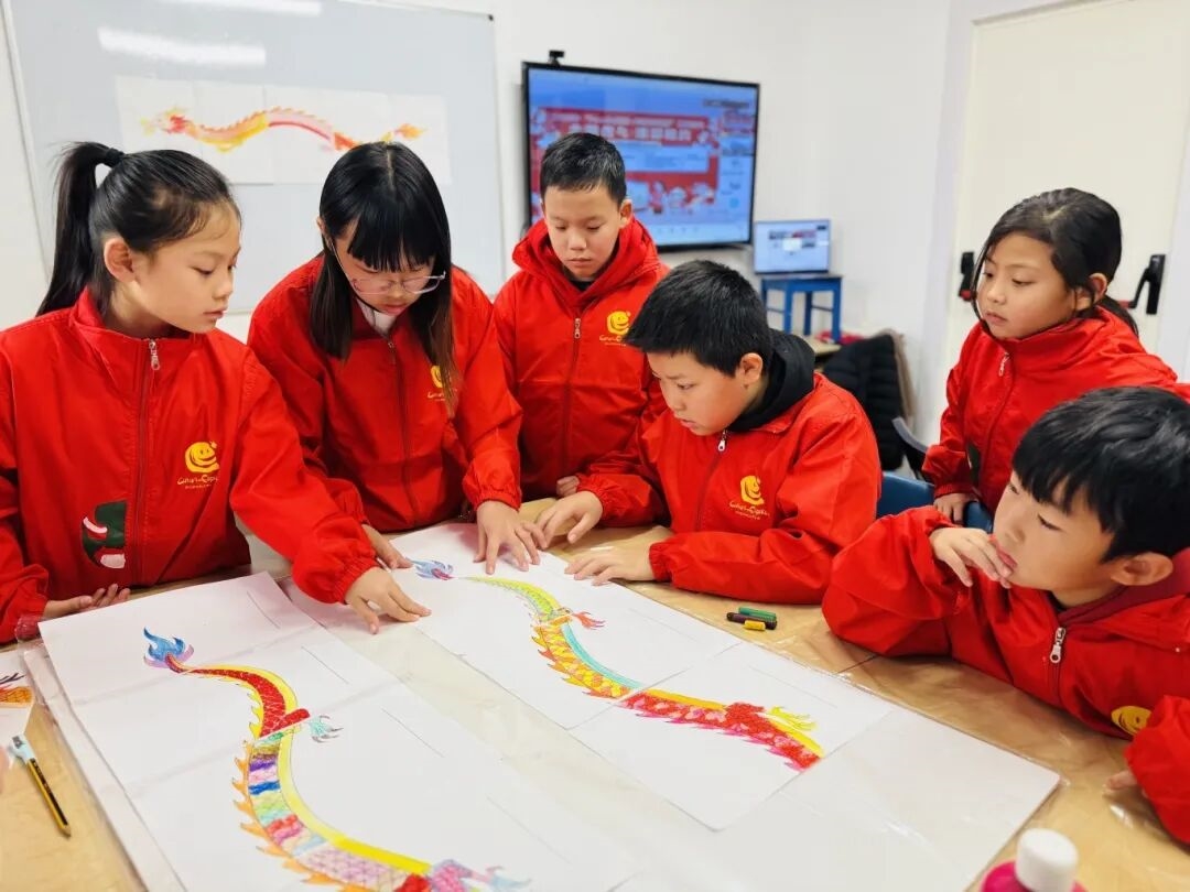 在金苹果锦城第一中学附属小学老师吴铱淼执教的《寻龙记》课程中,两地学生开启了一场生动的文化探索之旅。吴铱淼以“龙”为主线,引导学生认识龙的形象特征与文化渊源,巧妙融入“龙行龘龘”“龙跃云津”“生龙活虎”等成语,解读龙所象征的奋发精神与蓬勃气象。课堂还设置了“小组画龙拼龙”互动环节,学生们分组协作,分别绘制龙首、龙身、龙尾等部分,在屏幕两端热烈交流、共创共融,最终拼接出一条完整的中华巨龙,展现出跨越地域的文化凝聚力与实践创造力。