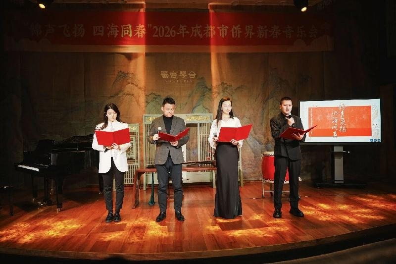 2月4日,“锦声飞扬 四海同春”2026年成都市侨界新春音乐会在武侯区文化馆蜀宫琴台国风分馆举行。在蓉侨界代表、中奥文化交流爱好者等70余人齐聚一堂,以乐为媒、共迎新春。
