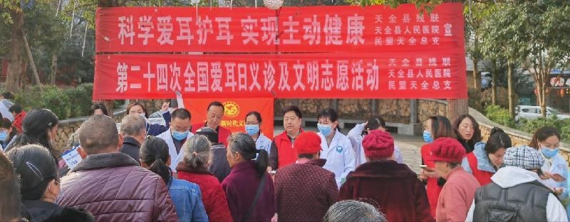 2023年3月3日是第二十四次全国爱耳日,为深入贯彻落实党的二十大精神和党中央、国务院关于实施健康中国战略的重大决策部署,普及听力健康知识,增强全社会听力健康意识,减少、控制听力损失和残疾的发生,天全县残联、天全县人民医院、民盟天全总支联合在县城音乐广场开展主题为“科学爱耳护耳,实现主动健康”爱耳日义诊及志愿服务活动。民盟天全总支部分班子成员、卫生支部骨干盟员全程参加活动。