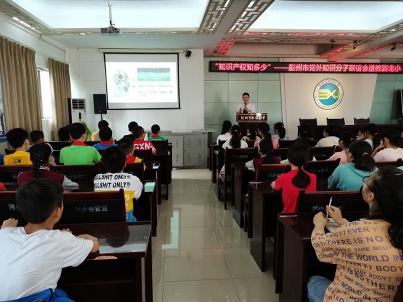 为加强全体师生对知识产权有关知识的了解,培养学生知识产权保护和创新意识,促进学校知识产权普及和保护,近日,彭州市知联会联合北城小学举行了一场“知识产权知多少”专题讲座,100余名高年级学生和部分教师代表参加了本次活动。活动由北城小学德育办组织,彭州市党外知识分子联谊会理事吴鄢神主讲。