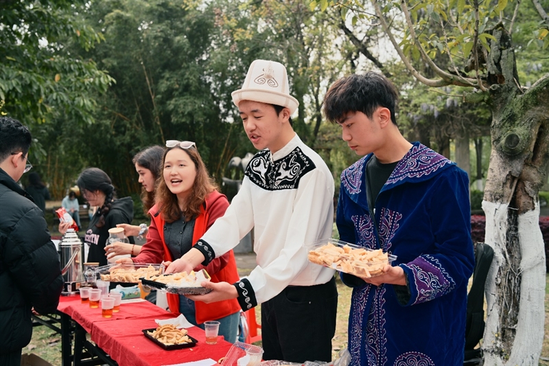 本次活动以文化人、以文聚心,设置各民族文化交流展示专区,各族学子身着特色服饰,现场展示特色美食、醇香茶饮、民俗文化,开展民族歌舞、器乐演奏、非遗扎染、民族文字书写等互动体验。师生在沉浸式参与中增进了解、加深情谊,推动“五个认同”入脑入心,让民族团结理念在潜移默化中根植于心。