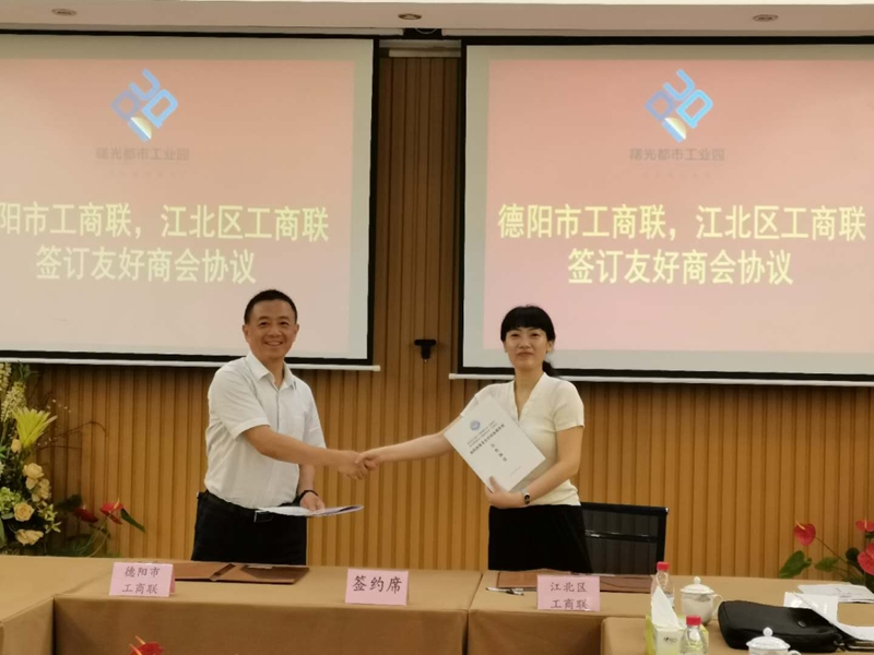 德阳市工商联与江北区工商联签订了《加快两地非公经济协调发展合作协议》,德阳市建筑房地产联合协会与重庆曙光都市工业园签订了《友好单位合作协议》,德阳市现代物流行业商会与江北区物流商会签订了《友好商会合作协议》。