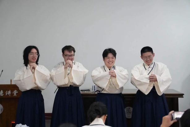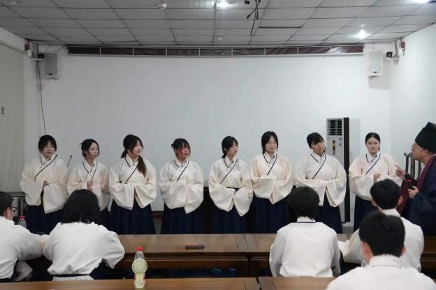 理论学习之后,同学们换上了古朴典雅的儒家学服,瞬间仿佛穿越回了古代学堂。在老师的指导下,认真学习万福礼、抱拳礼等传统儒家礼仪,同学们兴趣盎然,一遍遍练习,从最初的生疏到逐渐熟练,亲身感受着“礼”的规范与温度。