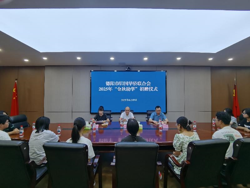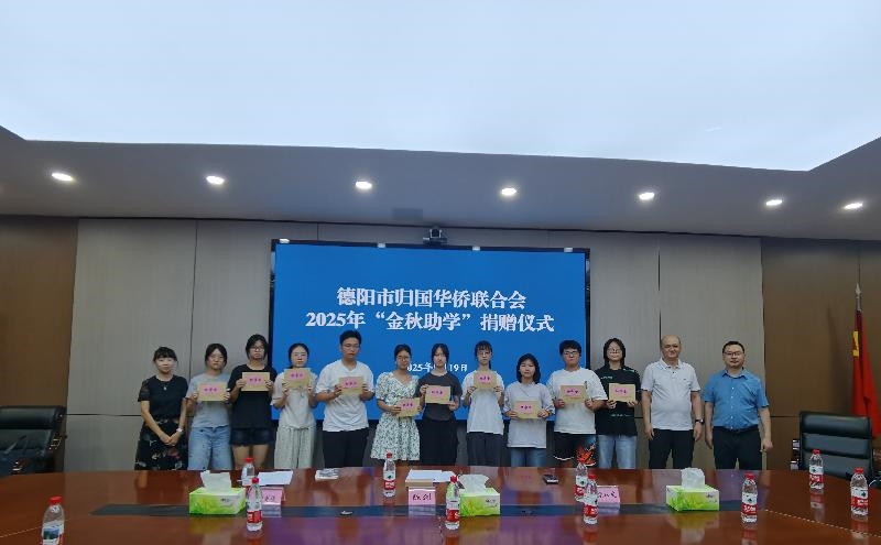 8月19日,德阳市侨联举行2025年“金秋助学”捐赠仪式。市侨联主席陈剑、市侨联兼职副主席钟澎俊、市侨联兼职副主席、市侨商联合会会长梁双庆、受助同学及市侨联机关干部参加仪式。