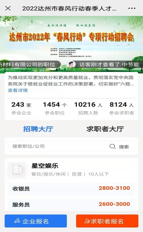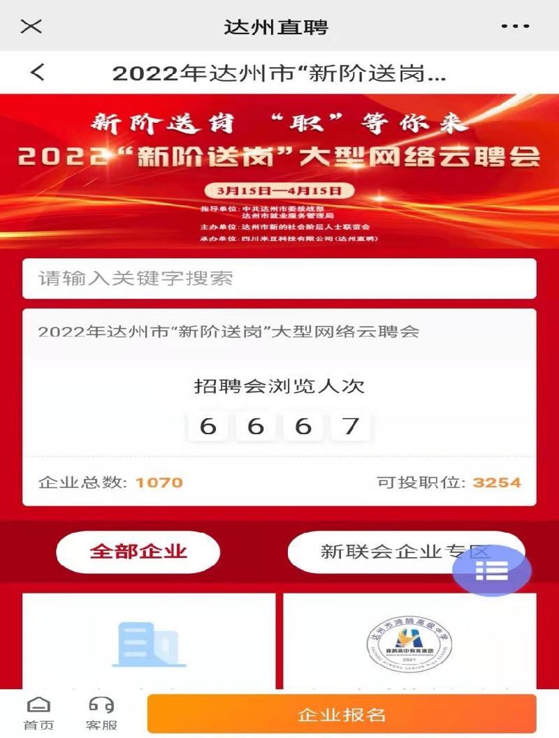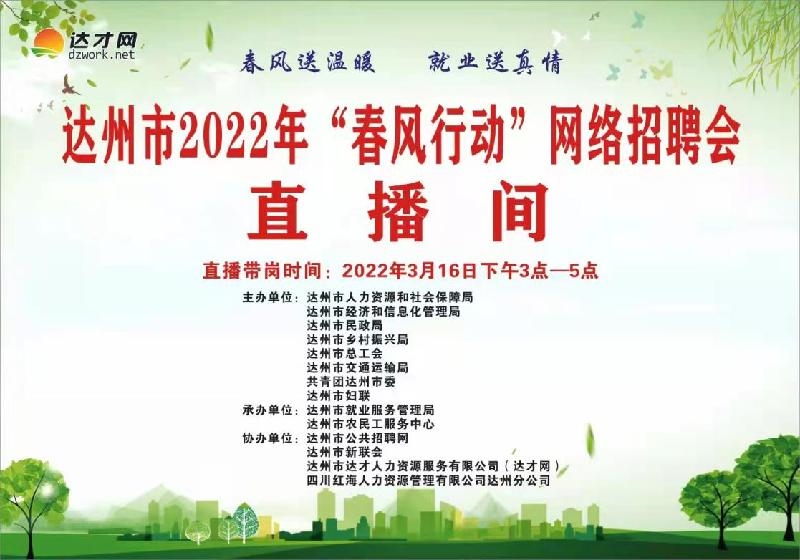 近日,达州市新联会在市委统战部、市人力资源社会保障局、市就业服务管理局的指导下,联合达州直聘、达才网等会员企业,成功举办了达州市2022年“新阶送岗”大型网络云聘会和“春风行动”网络招聘会等系列免费专项活动,致力于帮助企业复工复产、促进本地居民在达就业创业。