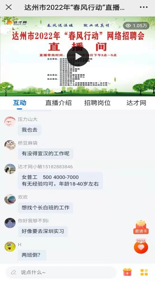 此次系列网络招聘充分利用新媒体平台受众广泛、传播迅速的优势,为全市有用工需求的企业和退役军人、农民工、下岗失业人员、贫困家庭劳动力、离校未就业高校毕业生等有就业需求的重点群体搭建企业招聘、人才求职双向服务平台,为稳定全市就业形势,助推全市经济社会高质量发展贡献了新阶力量。据悉,活动将持续开展到4月中旬,期间还会组织专场直播招聘会。下一步,达州市新联会将继续在严峻复杂的经济形势和疫情灾情的冲击影响下,围绕市委市政府核心工作任务,全力解决民生需求、传递民生温度。