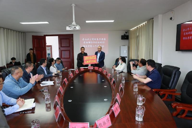随后,在大成镇召开了东西部协作村企结对帮扶考察工作座谈会。会上,舟山市工商联一行与镇、村负责人围绕乡村振兴和产业发展情况进行交流。舟山恒尊预拌混凝土有限公司、舟山舟环环境工程设计有限公司分别与南坝镇双柏社区、大成镇瓦窑村签订东西部协作村企结对帮扶协议,并分别捐赠资金5万元。