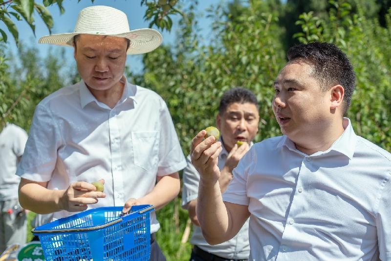 时下正是李子成熟的时节,达州市通川区北山镇点兵村田丰种植专业合作社的果园里,一颗颗饱满圆润的“达凤脆李”挂满枝头,弥漫着诱人的果香。为提升通川“达凤脆李”的知名度,帮助果农打开更多销售渠道,增添乡村振兴新动力。8月4日,在市委统战部副部长、市台办主任段昌林,区委统战部副部长、工商联党组书记徐飞的带队领导下,市、区两级新联会40余名会员代表走进田丰种植专业合作社开展“同心达州·新阶人士助力乡村振兴——走进通川”活动。