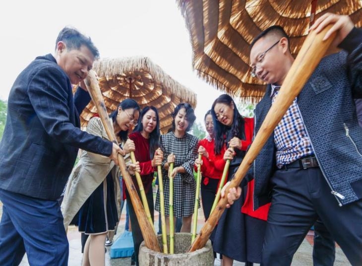 在“打糍粑 庆佳节”活动中,大家齐上阵,挽起袖子、紧握棒杵儿和芦竹杆,齐声喊着“嘿着、嘿着、舂糍粑啰!嘿着、嘿着、多快乐......”,没多久,散发着芦竹清香的热糍粑就舂好了。舂好后的糍粑从对窝里捧出来,搓成一个个圆圆的糯米团子,蘸上黄豆粉和红糖,在一片欢声笑语中,品尝着这份难得的美味,寄托着大家对“月圆、人圆、家圆、国圆”的美好愿望。