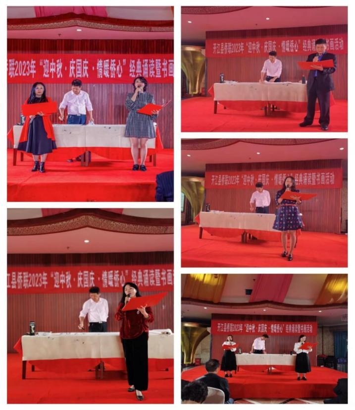 在“迎中秋·庆国庆·情暖侨心”经典诵读暨书画活动中,《中华颂》《祖国赞》《我爱你,中国》《百年芳华》《春秋鼎盛的党 巍然屹立的国》等一首首主题鲜明、极富感染力的朗诵,把侨界人士对祖国的热爱、对革命先烈的缅怀和对幸福生活的憧憬表现得淋漓尽致,赢得了在场观众的阵阵掌声。同时,来自县文促会和侨界的书画爱好者们欢聚一堂,以书画联谊、用笔墨交流,在挥毫泼墨中抒发爱国情怀。