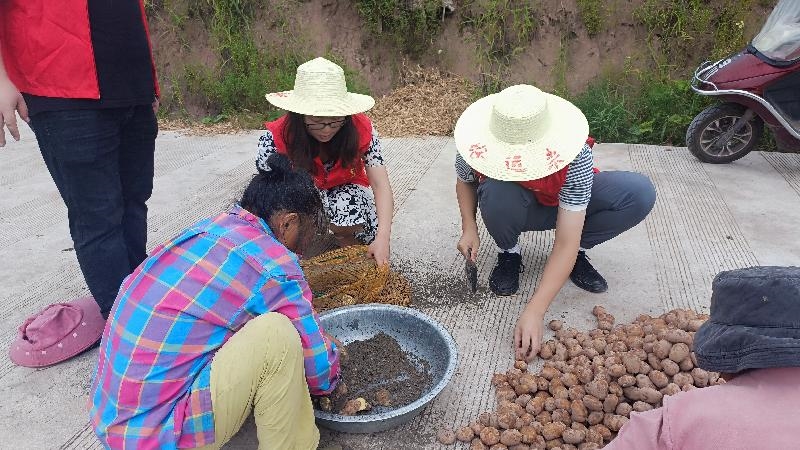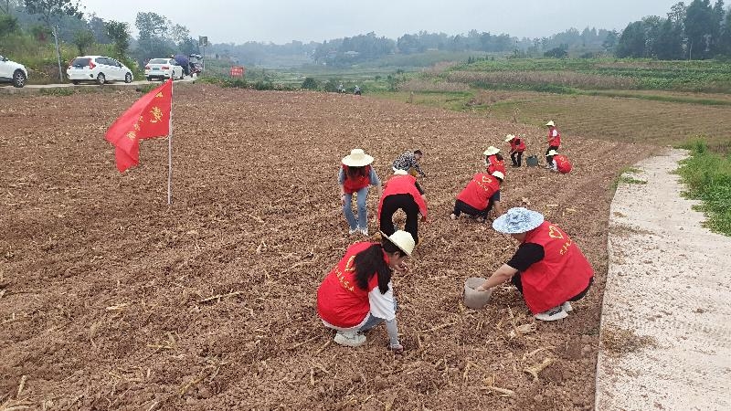 在观音镇清河村秋马铃薯种植示范片,身着红马甲的统战志愿者们,分工有序,干劲十足。一个小时不到,杂草基本清理干净,然后分种、打窝、放种、施肥、盖土,汗水挥洒在田间地头。经过一上午的辛勤劳作,志愿者们便种植了近3亩秋马铃薯。