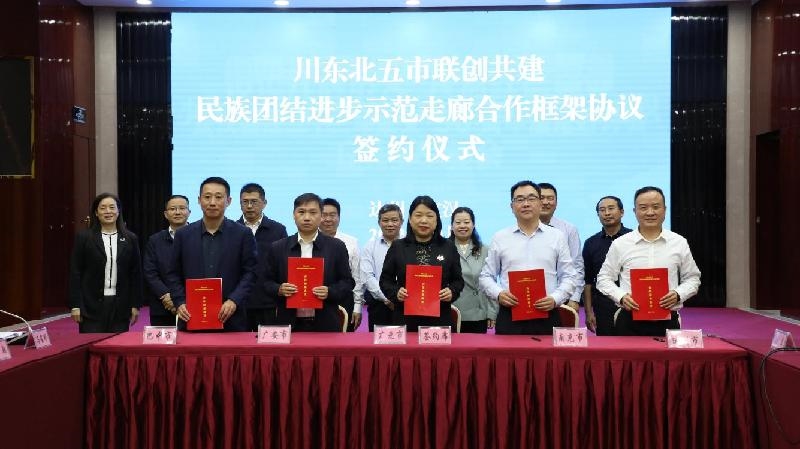 会上,广元市、南充市、广安市、巴中市、达州市签订了《川东北五市联创共建民族团结进步示范走廊合作框架协议》,明确了机制共建、家园共筑、文化共育、产业共兴、示范共创、社会共治六项举措。