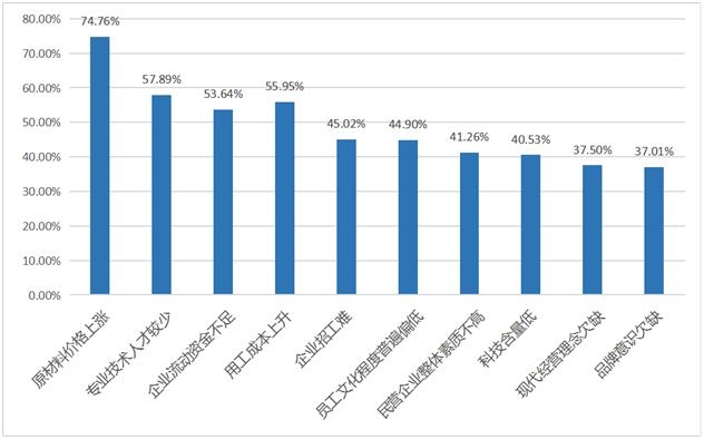 截至目前,位居前十的问题为:原材料价格上涨、专业技术人才较少、企业流动资金不足、用工成本上升、企业招工难、员工文化程度普遍偏低、民营企业整体素质不高、科技含量低、现代经营理念欠缺、品牌意识欠缺。其中:用工成本增加由第2位降至第4位,专业技术人员较少由第3位升至第2位,企业流动资金不足由第4位升至第3位,现代管理理念欠缺由第6位降至第9位,品牌意识欠缺由第9位降至第10位,员工文化程度普遍偏低由第10位升至第6位;材料价格上涨、企业招工难、民营企业整体素质不高、科技含量低四个问题排位没有变化,分别位居第1位、第5位、第7位、第8位。