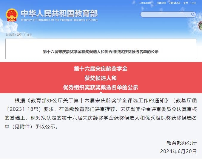 据悉,宋庆龄奖学金是1994年由教育部、中国福利会和中国宋庆龄基金会面向义务教育阶段中小学生设立的唯一的国家级奖学金;每两年颁发一次,旨在表彰鼓励中、小学生中思想品德、文化、艺术、体育、科技方面的成绩优秀者;小学四年级至初中三年级在校学生均可参与评选。