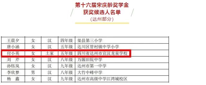 近日,教育部发布宋庆龄奖学金获奖候选人和优秀组织奖获奖候选名单公示,达州市宣汉龙泉学校土家族女生付小英同学拟认定为第十六届宋庆龄奖学金获奖候选人。