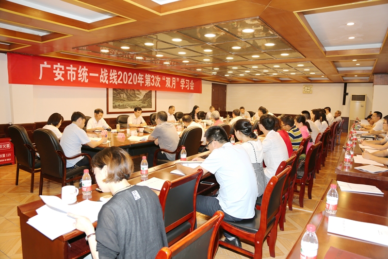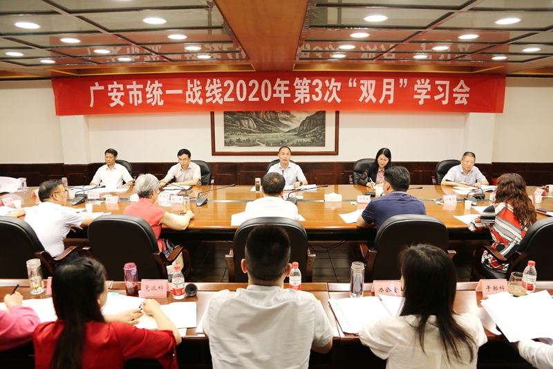 6月8日,广安市委常委、统战部部长陈伟主持召开全市统一战线2020年第3次“双月”学习会,传达学习贯彻全国“两会”精神,研究如何在争创成渝地区双城经济圈建设示范城市中,发挥自身优势,扎实有效地开展好新的“三个一”工作。各民主党派、工商联、知联会、侨联负责人,市委统战部全体干部职工参加会议。