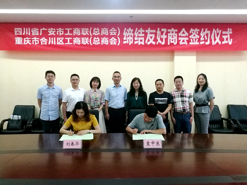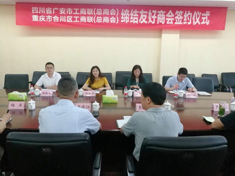 为认真落实中央、省委、市委决策部署,学习先进工作经验,搭建渝广两地民营企业合作桥梁,助力成渝地区双城经济圈建设,6月11日,广安市工商联主席刘春华带领机关同志一行赴重庆市合川区、渝北区工商联开展对标学习,缔结友好商会。合川区政协副主席、区工商联主席唐德江,合川区工商联党组书记袁中东,渝北区人大常委会副主任、区工商联主席王充,渝北区委统战部副部长、区工商联党组书记、常务副主席刘思伦等参加座谈会议,并共同见证友好商会的签约仪式。
