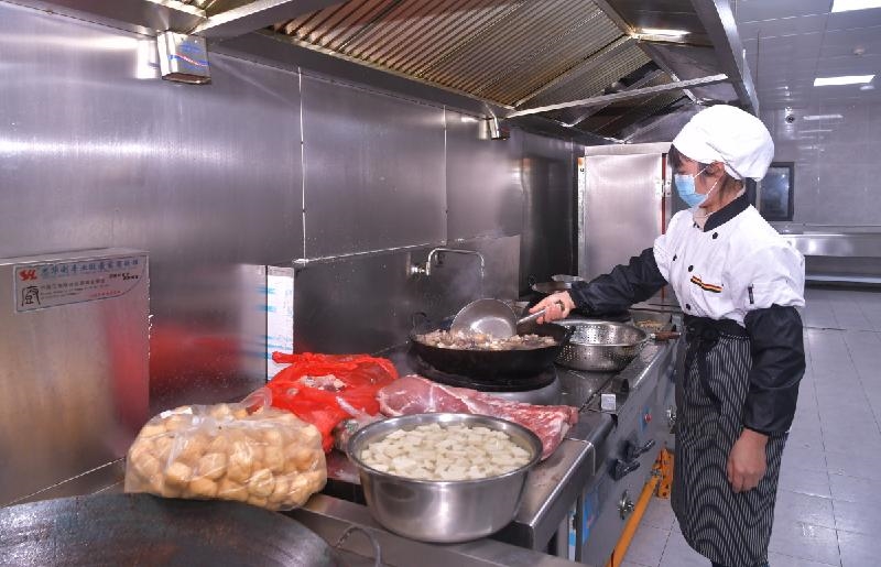 在世友木业公司员工食堂,两名厨师正精心准备着午餐。在食堂存储区,米面油菜等生活物资一应俱全。杨晓明表示,大米备足了一个月的量,蔬菜够吃一个星期,而防疫所用的口罩和消毒液都很充足。
