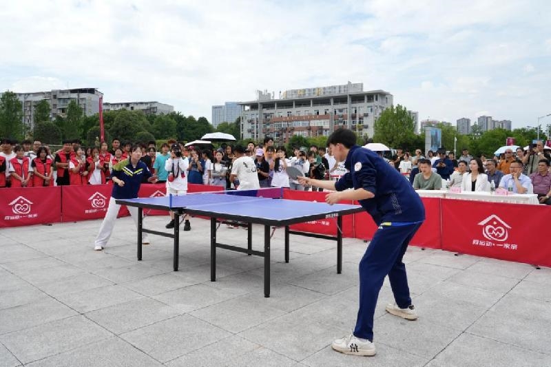 紧接着,非遗表演《云童舞》闪亮登场,优美动情的旋律,明快欢畅的节奏,生动阐释了宕渠賨人热情奔放、能歌善舞的性格和博大精深的宕渠文化,让人陶醉其中。随后,现场的乒乓球爱好者与省乒乓球队员进行了交流切磋,台上比赛精彩纷呈,台下观众掌声雷动,现场气氛热烈欢快,在场所有人感受到“同运动·一家亲”的温暖氛围。