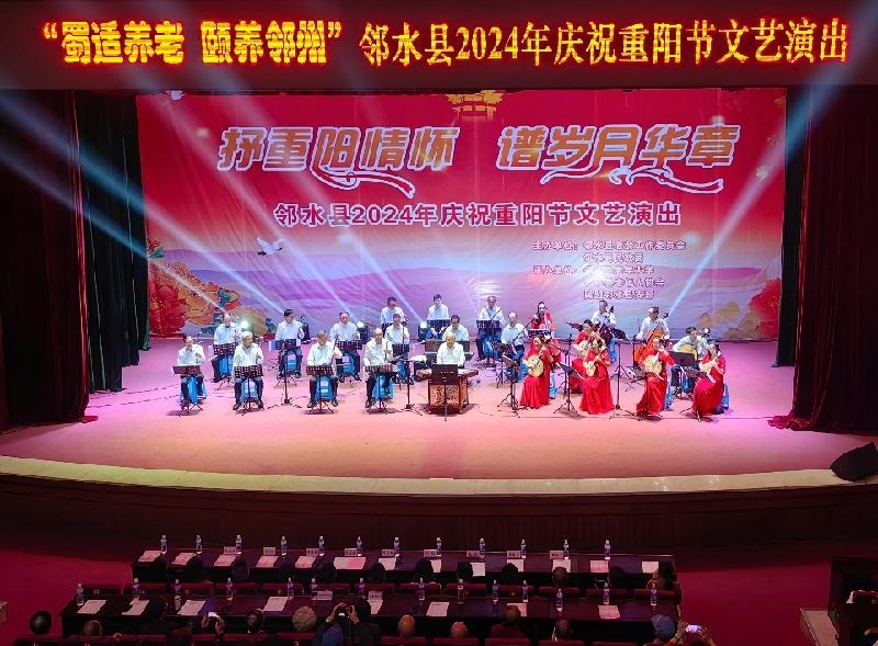 10月11日下午,民盟广安市委会直属邻水县支部携手县老龄工作委员会、县民政局等单位,在邻水县宣传文化中心开展“抒重阳情怀,谱岁月华章”邻水县2024年庆祝重阳节文艺演出活动。四川省民政厅二级巡视员周志军、四川省老年大学教育宣传部部长黄媛林等领导出席活动,中共邻水县委常委、副县长朱洺新致辞。民盟邻水县支部主委、县民政局局长魏洪军带领支部盟员参加本次活动。