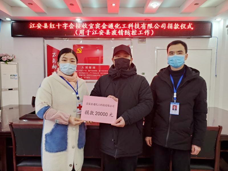 1月31日,江安工业园区宜宾金通化工科技有限公司给江安县红十字会捐款2万元,用于江安新冠状病毒感染肺炎疫情防控工作。