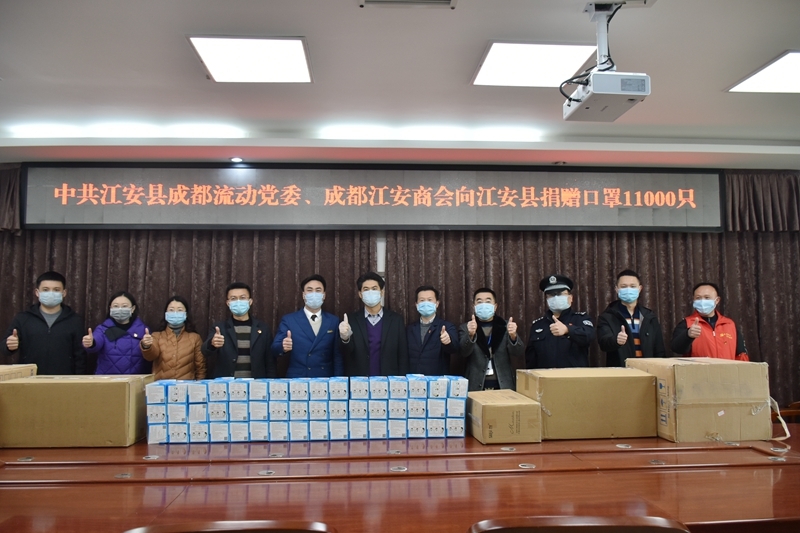 2月18日,成都江安商会向江安捐赠11000只口罩,这批口罩的到来,无疑解了燃眉之急。成都江安县商会长龙章其、中共江安县成都流动党委书记罗浩等一行专程驱车,千方百计从外地组织货源,支援家乡,将防护口罩运抵至江安县。江安县委常委、县委统战部部长刘万明出席捐赠仪式,对成都江安商会热心企业家们和中共江安县成都流动党委表示感谢、为其善举点赞。