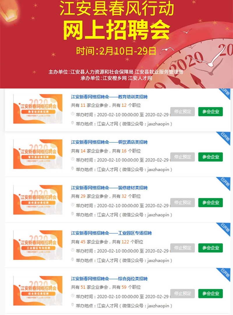 在疫期“做好科学防疫工作,积极响应强化网络招聘服务”的特殊背景下,江安新媒体分会会员单位积极助力企业恢复生产和促进企业发展提供人才保障,解决了“用工难”,群众“找工作难”的双向难题,与县人力资源和社会保障局合作,推出网络春季招聘会。下属平台“江安人才网”在线设立了教育培训类、餐饮酒店类、装修建材类、综合岗位类、工业园区5大专场,涉及企业商家118家,共计提供就业岗位类别440个,需求人数5500+。活动首场网络访问量高达11.3万,反响热烈。一周时间,访问量达31.5万,收到简历3008份。