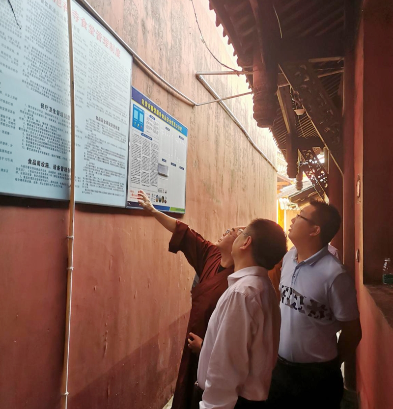 在天池禅寺,检查组听取了寺庙关于食品安全、消防安全、疫情防控等安全工作的情况汇报,现场查看了各项规章制度和疫情防控台账等资料。