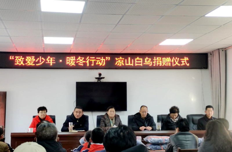 近日,致公党北京市委“致爱少年•暖冬行动”捐赠活动在凉山州盐源县白乌镇举行。州政协副主席王阿呷、州政协副秘书长苏彬,州委统战部副部长罗阿呷、盐源县委副书记岭明出席捐赠仪式,捐赠仪式由盐源县政协主席张应聪主持。