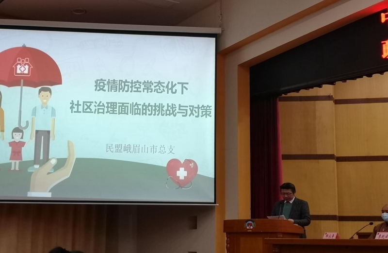 开幕会上,民盟峨眉山市总支主委胡文钧代表民盟组织作了题为《疫情防控常态化下社区治理面临的挑战与对策》的大会发言。