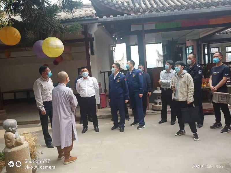 2021年3月30日,德阳市委常委、统战部部长、总工会主席何雨带领市应急局、消防支队相关人员到我县调研宗教场所森林防灭火暨消防安全工作。市委统战部副部长、市民宗局局长简鸿彬,县人大副主任龙昌泽等相关领导陪同调研。