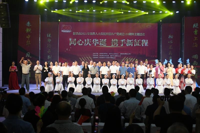 6月21日晚,射洪市“同心庆华诞 携手新征程”2021年各界人士庆祝建党100周年主题活动在市艺术剧院隆重举行。射洪市委书记、四川射洪经开区党工委书记张韬,市委副书记、市长王能,市政协主席、市委宣传部长邓茂,四川射洪经开区党工委副书记、管委会主任陈学,市委副书记潘化荣等在家射洪市领导出席活动。