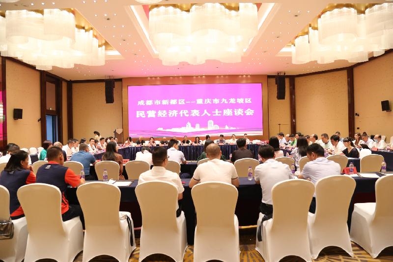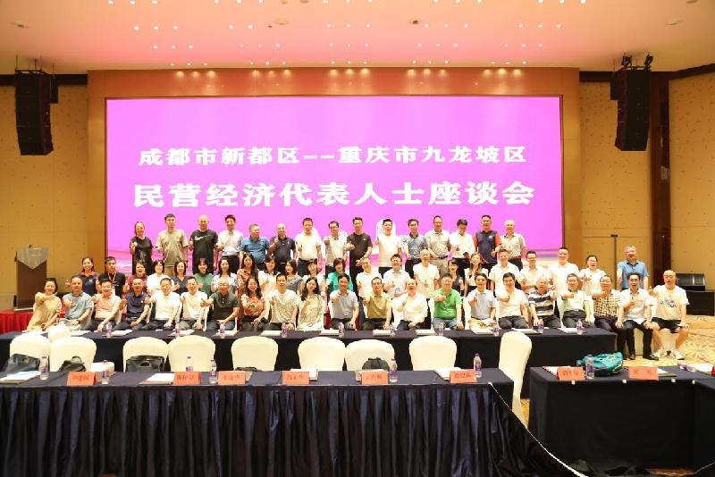 为深入贯彻习近平主持召开中央财经委员会第六次会议精神,推动成渝双城经济圈建设,加强成渝两地民营企业家交流合作,促进成渝两地民营企业发展。7月6日,成都市新都区-重庆市九龙坡区民营经济代表人士座谈会在七一世外桃源酒店召开。新都区政协副主席、工商联主席陈善彬带领区委统战部副部长、工商联党组书记刘杨军,区工商联副主席兼秘书长何智斌,区委统战部党派科科长、工商联党组成员孙浩然,区工商联办公室副主任罗明龙以及我会23名会员企业家参与座谈会。九龙坡区民营经济服务中心主任封筠带领九龙坡区50位优秀民营企业家参加会议。