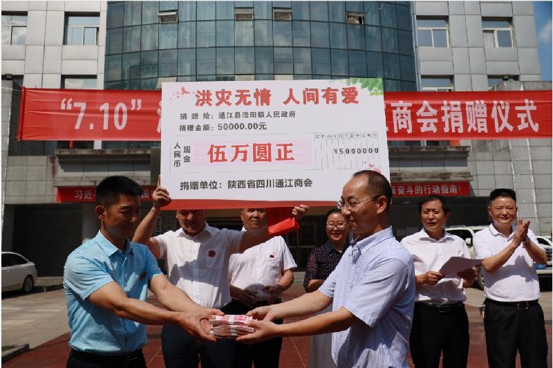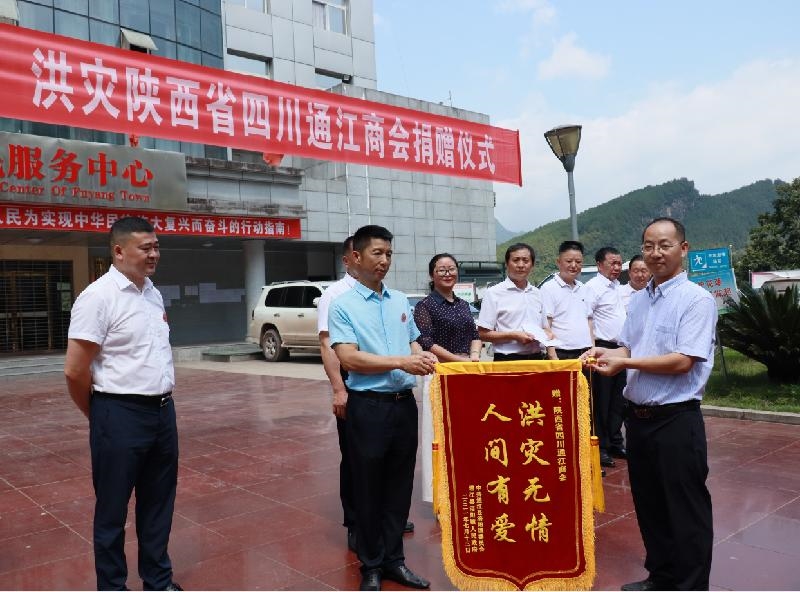 在捐赠仪式上,陕西省四川通江商会副会长李华代表商会向涪阳镇党委政府捐赠救灾款5万元,涪阳镇党委政府向商会赠送了锦旗,县政协副主席李思岚作了讲话。
